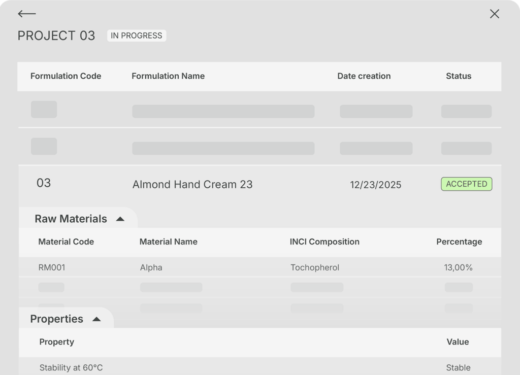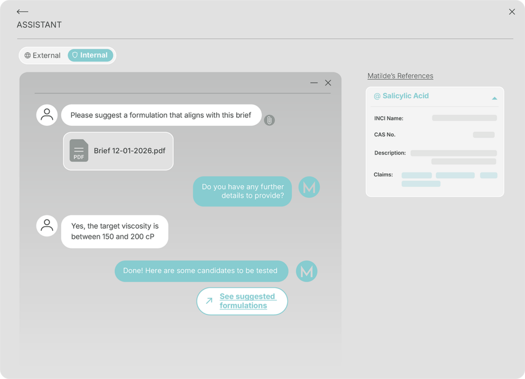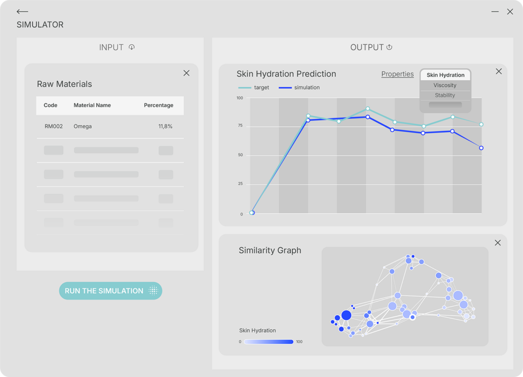 - Predizione e simulazione: inserendo una composizione di ingredienti, Matilde predice immediatamente proprietà come viscosità, pH, stabilità, densità, durezza e parametri sensoriali specifici per ogni settore, supportando il formulatore step dopo step nel processo formulativo.